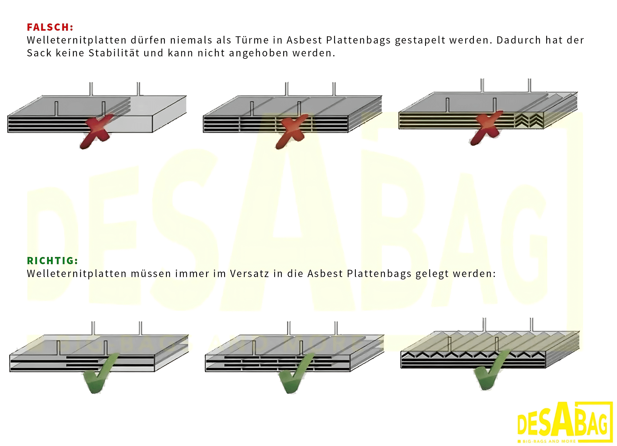 In den Plattenbag Asbest Standard 260x125x30cm können Sie ca. 20 Lagen übereinander verpacken. Aufgrund der unterschiedlichen Größen der Platten, kann nie genau gesagt werden, wie viele Asbestplatten in einen Plattenbag passen. Beachten Sie beim verpacken der Asbestplatte bitte das folgende Verpackungsschema!
